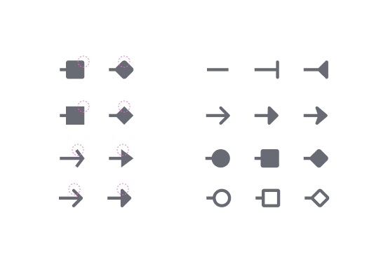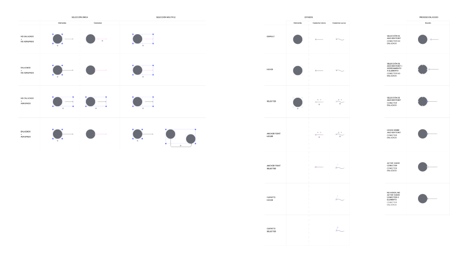 In addition to the technical specifications of the graphics, the delivered document also includes all the casuistry of the interaction of the connector, how it relates to the other elements, the different states of the anchors, what happens when it is grouped, etc..